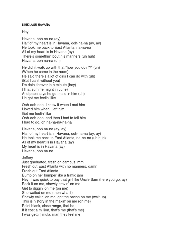 . 2 kali Kelahiranmu Muhammad. Havana ooh na-na ay Half of my heart is in Havana ooh-na-na ay ay He took me back to East Atlanta na-na-na uh huh Oh but my heart is in Havana ay My heart is in Havana Havana ooh na-na Young Thug Jeffery Just graduated fresh on campus mmm Fresh out East Atlanta with no manners damn Fresh out East Atlanta. Membantu anak haiwan dalam kesusahan.